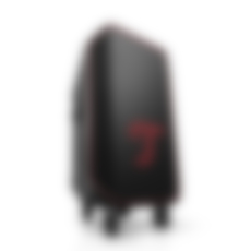 Person holding a large black bag with a logo, next to a skateboard on a sunny outdoor surface.